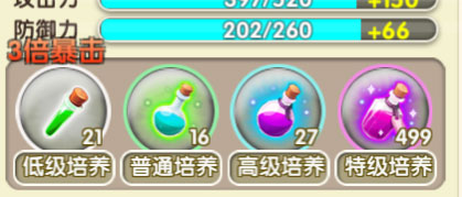 宠物品阶属性加成分别是生命值、攻击力、防御力。属性值需要使用培养液增加,培养液根据品质的不同,属性加成也不同。分为低级、普通、高级、特级,品质越高增加的基础属性越高,触发暴击效果的概率也会提高。