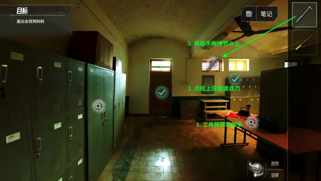第二步:在【逃出更衣室】的场景探索里,从工具箱中获取“扳手”、在衣柜上获取“螺丝刀”,然后拖拽扳手到窗户处的⊕上