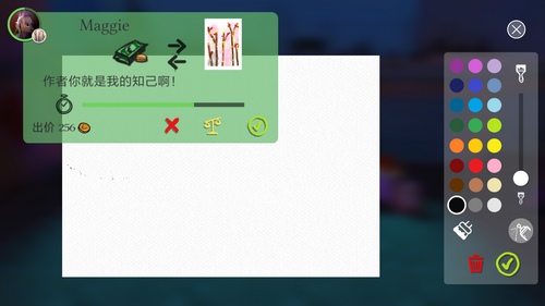 玩家需要用右边的画板在白纸上画出自己的作品,然后摆出售卖,只要自己画出来的作品能让npc喜欢,他们就会花费不同的价钱来买画。