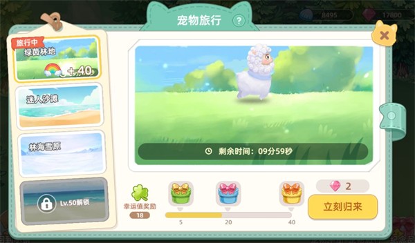 四、点击宠物场景右下角的“宠物旅行”按钮,打开旅行界面,左侧有很多可供选择的旅行地点。不同地点需求宠物数量不同,随着宠物等级提升,派遣幸运值也会增加,带回来的礼物则会越来越丰富。