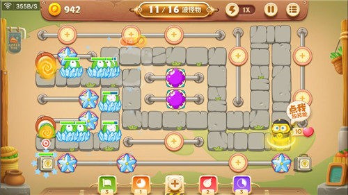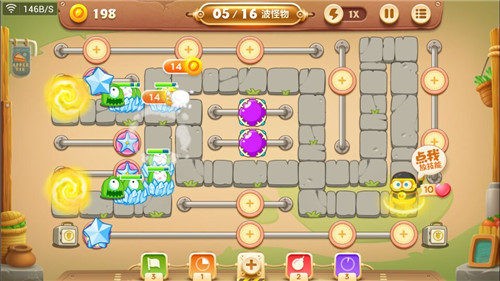 因为前期主要输出靠魔法球,所以防止万一在魔法球附近放置一个冰冻星,用来减速。这对接下来的清除障碍物非常有帮助。