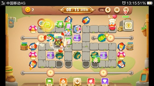 在开始攻击左上角的大钱箱 大钱箱打掉后会出现四个蘑菇炮塔 因为蘑菇炮塔有减速的效果 所以我们只保留一个将其升到满级 其余的可以卖掉 剩下的钱开始如图摆放其它的炮塔。