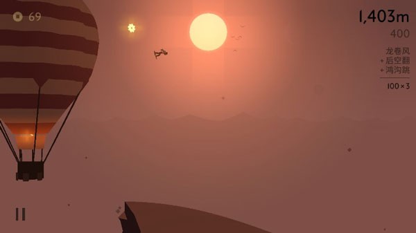 阿尔托的奥德赛游戏的场景设计充满想象力:像碾过藤蔓触发机关、借助热气球弹跳至高空、在坍塌的寺庙边缘滑行,玩家甚至与狐猴群赛跑。任务系统包含180个目标,从基础操作到复杂动作的挑战,满足硬核玩家需求。此外,禅模式去除分数与失败惩罚,搭配空灵配乐,成为玩家放松身心的不二选择;而照片模式允许玩家定格沙漠奇景,分享艺术级画面。游戏通过简约操作与丰富机制,使玩家在宁静与刺激间找到平衡。总的来说,阿尔托的奥德赛堪称移动端跑酷游戏的标杆之作。