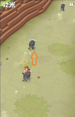 1、开玩画面中,人物会骑驾着小野牛,带着套索在地面上奔跑,按着画面不松开,在距前方的动物较近时,向前一滑,瞬间跳入。