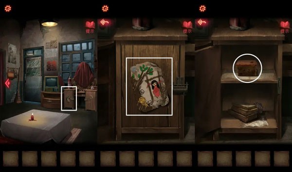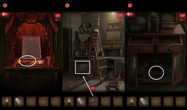 13、根据神龛上的书的描述,用【口红】点击坛子,将绳子涂红,碎掉的坛子上拿到【半张照片】。