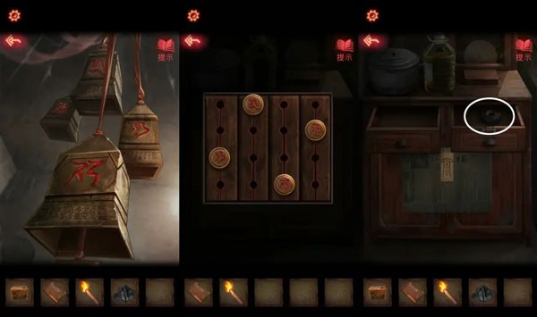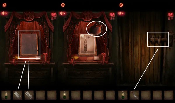 14、将两张【半张照片】放进相框里,神龛木板上拿到【鬼头刀】,用【鬼头刀】劈开木门,逃出屋子。
