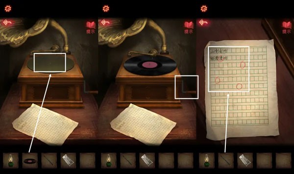 9、【煤油灯】在桌上的蜡烛点燃,进入房间。根据【反字日记】上的提示,调整架子上的物品,拿到【唱片】。架子上拿到【铅笔】,日记本往后翻页拿到【半张照片】。