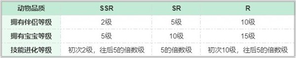 不同的品质的动物达到一定等级时,会拥有伴侣和宝宝并且进化技能,升级需要的动物碎片可以在动物班车、活动-幸运翻盘、每日签到、主题季、庆典宝箱等获得。