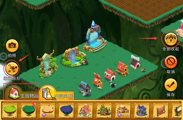 3、【全部收起】按钮能把庄园内可以移动摆放的东西全部暂时收到【庄园物品】栏中,方便重新摆放。