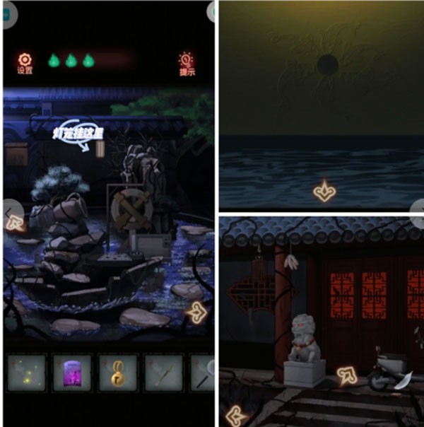2、去左视野,取得画架下方盒子内的传单,出画室去左视野,拾取渔网,点击棋盘得到灯笼,去左视野,点击相思牌,再用渔网抓萤火虫,去右视野,把灯笼挂在钩子上,将萤火虫放入灯笼,点击灯笼拾取日晷。去右视野,把铃铛挂在石狮脖子处,从石狮口中得到指南针。