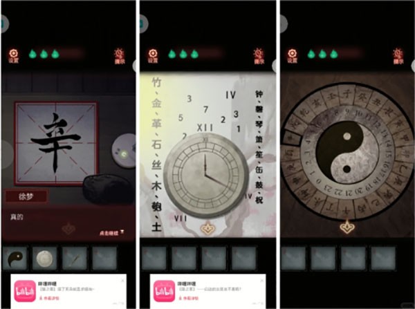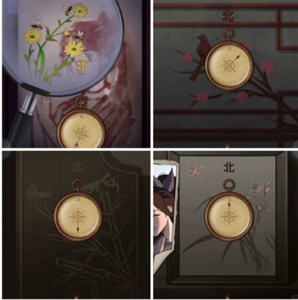 5、打开八音盒获得黑勾玉,出画室,用放大镜打开电动车椅盖,获得纸条线索,回画室,查看墙上永字,在桌上的米字格写字,去出去查看纸条线索背面,返回画室桌子写字。点击右侧有画卷的一边,点击画卷并把日晷放上,根据罗马数字XII把分针放在日晷处,获得线索IV=4。