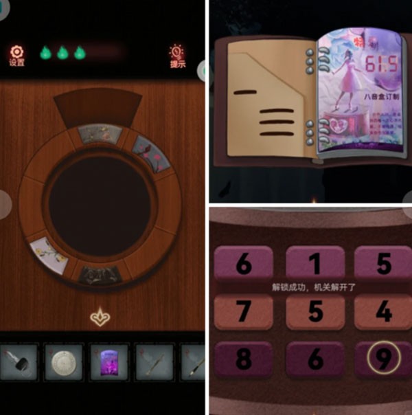 4、出画室,去左视野,点击左侧的信箱,根据指南针查看的线索,如配图调整机关,打开信箱获得八音盒传单。回画室,去有古琴的小圆桌处,把两张传单放入宣传册中,将两处数字线索:615,754重合得到密码:869,点击架子下方柜子内的八音盒,输入密码:615,754,869