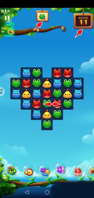 3、接下来,由于消除了 3 个青蛙,上方的任务牌就变成 7 了;同时由于用掉了 1 步,可用步数也变成 11 了。