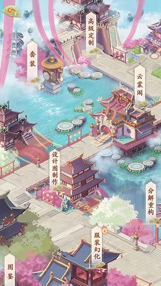 进入服装系统主界面会看到高级制定、套装、云裳阁、设计图制作、分解重构、服装幻化、图签六个选项,每个选项都有其特定的功能。玩家可以在云裳阁购买衣服、鞋子、头饰等配件。高级定制可以定制染色套装,集齐特定的原料和染料才能定制出服装。
