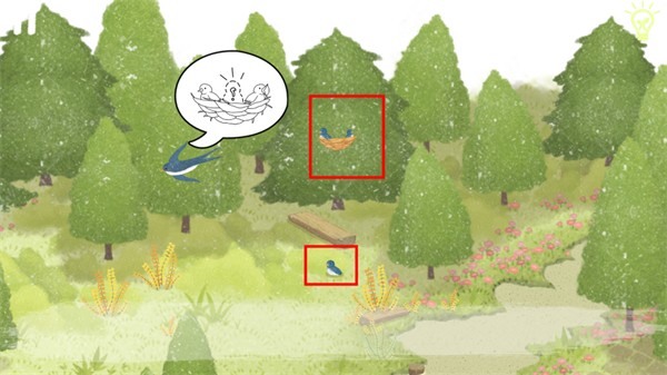 点击地上红框处的小燕子,接着在左下物品栏拖动“小燕子”给红框处的鸟,成功帮助到了燕子妈妈。获得了“燕子羽毛”。