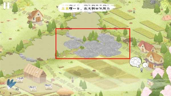 日子到了立春,但是左下的农民大叔犯了愁,因为田地的上空乌云密布。点击乌云,驱散后继续点击,直到乌云完全消散。