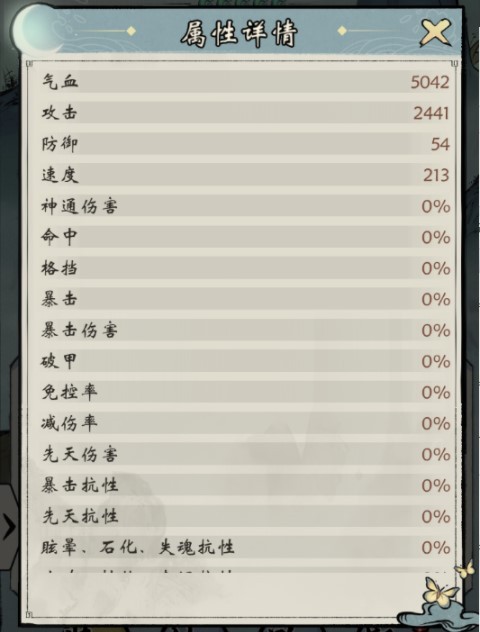 异客:气血+87.2% 攻击+50% 格挡+28% 命中+21% 神通伤害+44% 速度+80