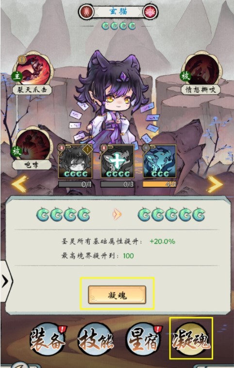 凝魂可开发圣灵潜能,增加圣灵最大等级,与此同时,圣灵的基础属性与主被动技能也会加强。各圣灵进阶所需材料可在圣灵图鉴;进阶预览中查看,如果后悔了,还能在祈灵台、圣灵化境中消耗化境丹化境圣灵,收回全部凝魂材料
