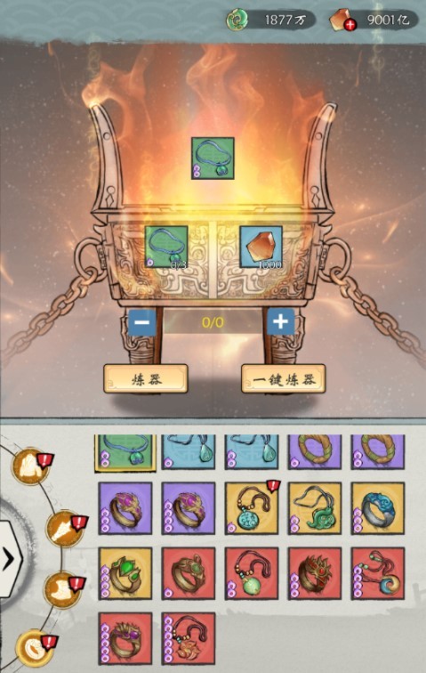 加入宗门后,前往宗门、炼器阁,消费一定量的装备材料和灵石便可炼制装备,点击一键炼器合成更强力的装备,套装更有属性加成哦。
