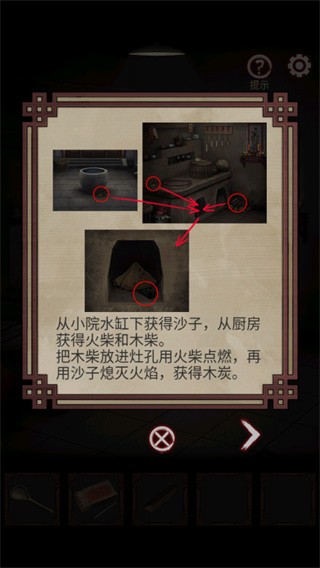 5、拿起水缸下的沙子,然后进入右边房子,找到勺子、火柴与木头,根据提示得到木炭;