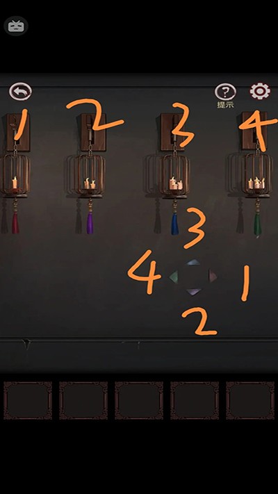 回到前面走廊,右边的墙,墙上红灯笼1个蜡烛,紫2个,蓝3,绿4,旁边的线索:右红1,下紫2,左绿4,上蓝3;