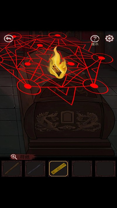 4、左边箱子上有符号刻着,跟之前门里走廊顶的符号很像,组合起来便是密码,开箱获得火柴和部件;