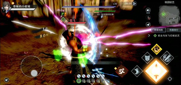 第四阶段,大战关羽。这个首领战场景与对战张飞时差不多,同样有两个光圈,但关羽的强度明显强过张飞,拥有大量的连击技能,攻势更为迅猛。首领战4分钟后进入狂暴状态。