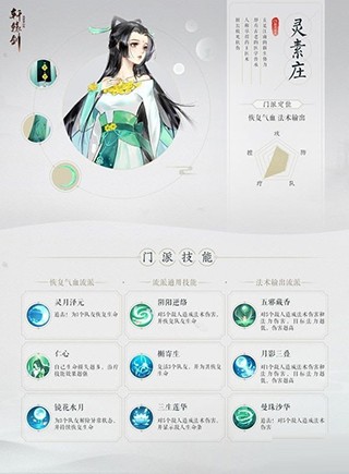 冰肌玉肤,眉心花钿轻点;碧色绸缎,勾勒窈窕身姿。灵素庄遗世而独立的佳人形象,令人见之忘俗;济世救民的慈悲之心,更是为人称道。配音演员新月冰冰的优美声线,将其儒雅医者的风范演绎得淋漓尽致。灵素庄门派尽得药王真传,门下弟子皆为通晓医术之才,以济世救民为己任,亦可法术输出。门派技能主要分为恢复气血与法术输出两个流派,玩家可根据需要自由选择。
