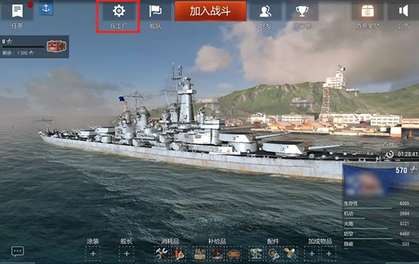 舰长们只需在主界面点击【兵工厂】按钮,进去之后就可以见到改造战舰的地方了!