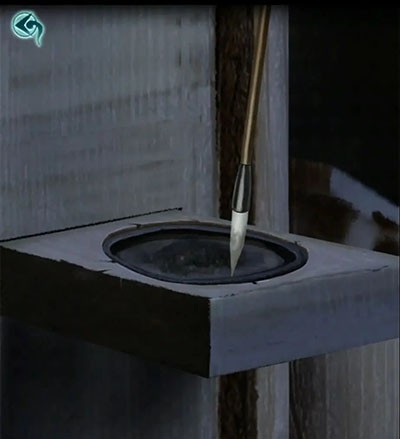 中间位置拿到一个水桶,出门对水缸使用水桶就获得水了,回来后给弹出来的砚台洒水,然后放上草木灰再使用墨块,查看右边塑料布提示在这里给衣服染色,再看一下中间位置的绿色颜料提示干掉了,继续使用水桶获得绿色染料,但是没有工具啊,查看右下角的箱子,提示三角形-方形-圆形,那么根据日历上的线索就获得了密码081828,调整完毕打开拿到刷子和毛笔。