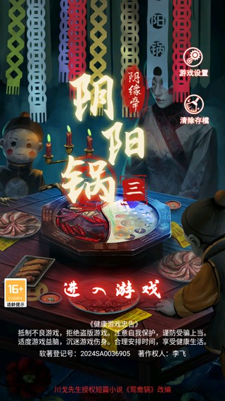 阴阳锅3阴缘牵是一款中式民俗悬疑解谜游戏,延续了系列经典的阴阳锅传说,以川渝地区为背景,将火锅、麻将、防空洞等地域文化符号与灵异故事深度融合。玩家将扮演主角宋楚阳,因一场诡异的深夜火锅宴误食阴阳锅,被迫卷入人鬼纠缠的阴缘谜局。阴阳锅3阴缘牵通过阴森诡谲的老街巷、布满民俗符号的密室场景,以及方言配音的沉浸式叙事,给玩家在解谜过程中营造出浓郁的悬疑氛围。