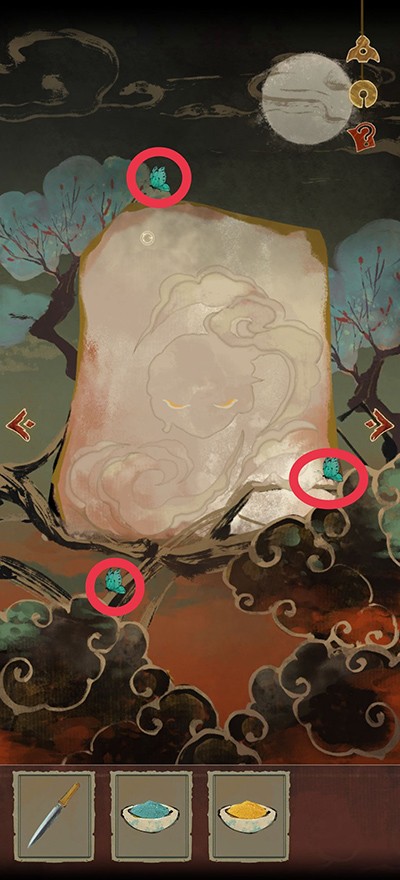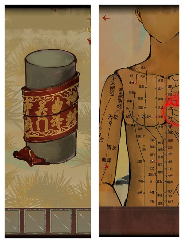 9、然后糖画拿给小女孩,被嫌弃不甜,来到字墙,把“甘”拿出来扔井里,把甜甜的糖画给女孩,结果女孩说要花,打开针灸盒,根据之前缠在柱子上的布条得到四个穴位,扎针,把木心交给女孩,听个故事,要木心开花,去字墙找“感”,扔井里,木心开花得到真心,发现是俩双胞胎女孩。