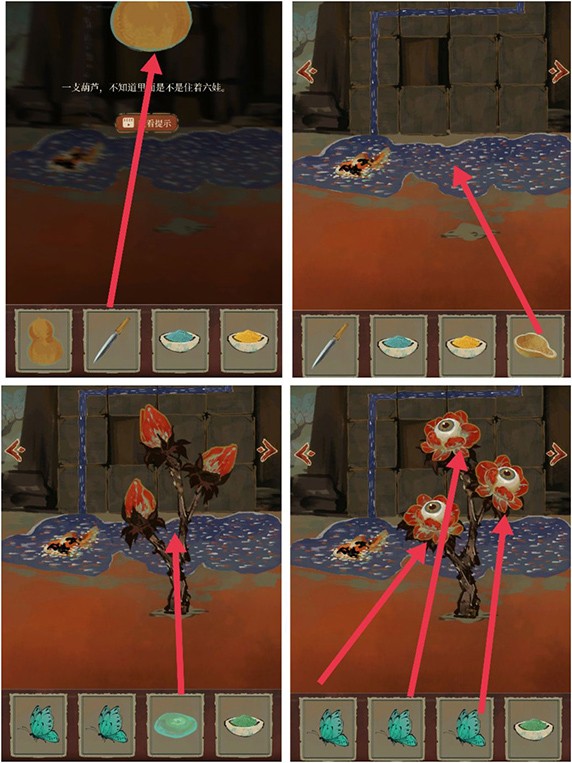 5、然后将种子种在拔出匕首的坑里,拿匕首把葫芦劈开,舀水,浇水,再用玉石催化一下,最后把蝴蝶放在花上传粉(?),就会飞出来一只鸟把鱼带走,最后留下一个盒子。