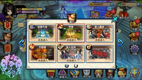 大家点击游戏操作界面左侧的修行按钮,在弹出的系统菜单中,选择“夺宝”进入夺宝系统操作界面。