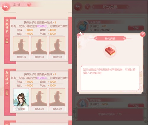 每一位知己的初始阶段都为一面之识,小主可通过赠送知己道具,增加知己的属性总和以及亲密度,在皇家苑囿的积分兑换中,可使用积分兑换提升知己情谊的道具,当知己的属性总和以及亲密度达到要求,并拥有对应情谊所需要的道具,则可以提升知己的情谊哦。越高级的情谊所需要的属性总和以及亲密度越高,相应数量也越少,最高级情谊为一生挚爱,小主们加油哦~