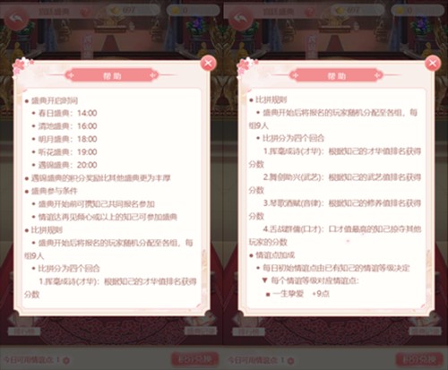 提升知己的情谊,可以提高小主的势力,同时也可以解锁乾清宫,参与宫廷盛典。每提升一位知己达到再见倾心,则可以多参加一场盛典,最高5场盛典,每场盛典开启时间都不同,小主可在盛典开始前,派遣知己参与,参与前可以分配情谊点,临时增加知己的属性。每场盛典比拼分为4个回合,分别比拼才华、武艺、音律、口才四项属性,其中才华、武艺、音律回合可获得分数,口才回合可以掠夺其他玩家分数!以最终分数作为排名依据,根据排名发放奖励。