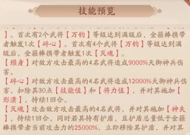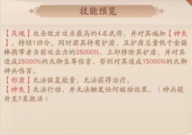 【灭魂】攻击敌方攻击最高的4名武将,并对其施加【神失】,持续1回合,同时若其持有护盾,且护盾总量低于金箱棒携带者当前攻击力的25000%,立即移除其护盾,并对其造成25000%的天御至尊伤害,否则对其造成15000%的天御神兵伤害。