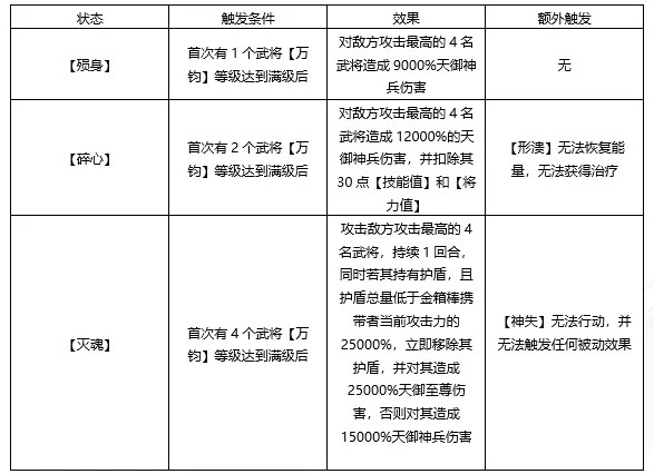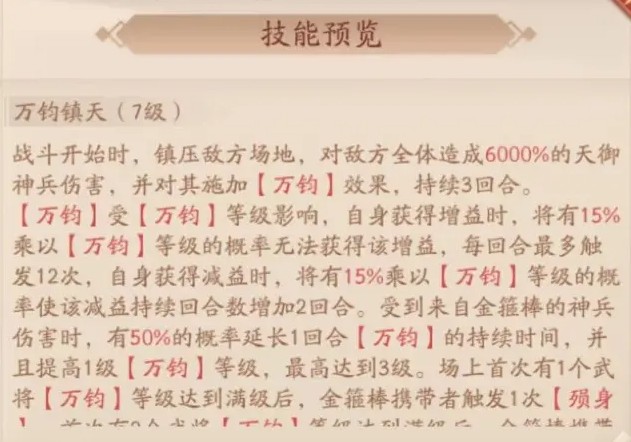 战斗开始时,镇压敌方场地,对敌方全体造成6000%的天御神兵伤害,并对其施加【万钧】效果,持续3回合。【万钧】受【万钧】等级影响,自身获得增益时,将有15%乘以【万钧】等级的概率无法获得该增益,每回合最多触发12次,自身获得减益时,将有15%乘以【万钧】等级的概率使该减益持续回合数增加2回合。受到来自金箍棒的神兵伤害时,有50%的概率延长1回合【万钧】的持续时间,并且提高1级【万钧】等级,最高达到3级。场上首次有1个武将【万钧】等级达到满级后,金箍棒携带者触发1次【殒身】。首次有2个武将【万钧】等级达到满级后,金箍棒携带者触发1次【碎心】。首次有4个武将【万钧】等级达到满级后,金箍棒携带者触发1次【灭魂】。