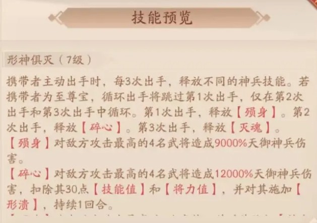 携带者主动出手时,每3次出手,释放不同的神兵技能。若携带者为至尊宝,循环出手将跳过第1次出手,仅在第2次出手和第3次出手中循环。第1次出手,释放【殒身】。第2次出手,释放【碎心】。第3次出手,释放【灭魂】。【殒身】对敌方攻击最高的4名武将造成9000%天御神兵伤【碎心】对敌方攻击最高的4名武将造成12000%天御神兵伤害,扣除其30点【技能值】和【将力值】,并对其施加【形溃】,持续1回合。