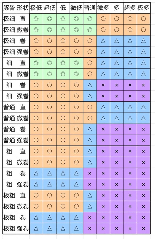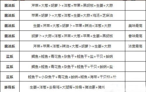 解锁七个熬汤材料前,先用自带的汤,解锁七个后就可以用下面的配方,如果没有那些熬汤材料,那就随便了,比自带的好就行;面也是先用自带的,然后用艾蒿面粉+大自然碱水,再换成最高级面粉+球藻碱水,没有强迫症就全部用35%加水率的极粗直面(对于同面粉碱水加水率来说成功率最高)。