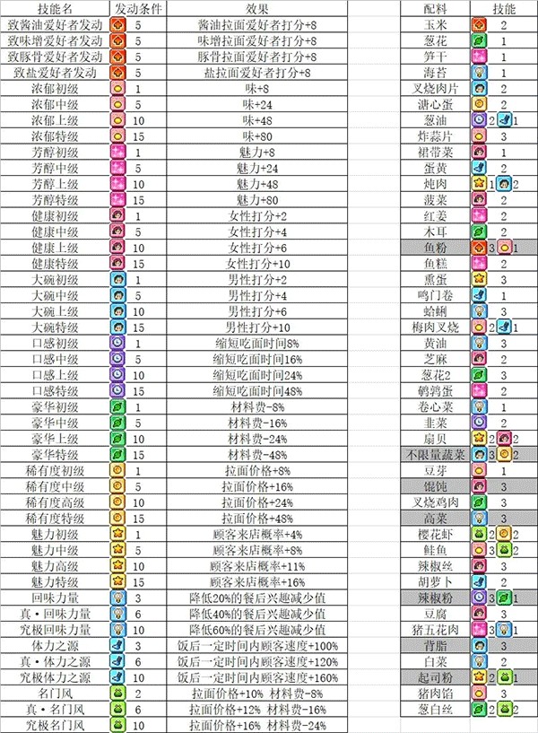 ③配料对应技能和效果。灰色背景为不可购买的配料,致XX爱好者发动是什么面就发动什么爱好者。