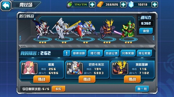 玩家可自行设置、调整防守阵容,每次系统推送3个对手供玩家选择,点击对手头像可以查看对方的阵容,再根据对方阵容选择自身上场机体;如果觉得3个对手都无法战胜的话,可以点击“换一批”来更换对手,玩家可以利用这一功能来增加胜率,取得更好的排名!