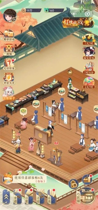 4、除此之外,你还可以在茶馆里自定义你的茶馆风格、遇见各路能人义士、听他们讲梦梁城的故事,店员也需要厨艺试炼增进厨艺,承接一些大大小小宴席委托等等,一起把茶馆做大做强,成为梦梁城里数一数二的大茶馆!