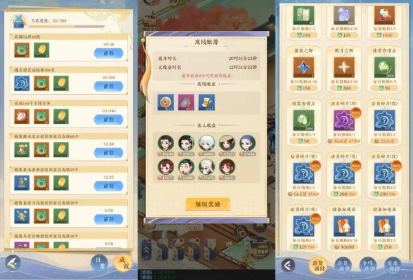 众所周知,茶馆的名声越大,生意自然就会越好!掌柜可以通过招待客人、完成【日常任务】和【名流之宴】,以及领取[离线账簿],获得相应的店铺声望,来提升店铺等级。