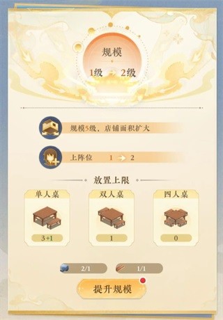 除了店铺和设备的升级,掌柜们也要注意提升茶馆的规模!提升规模后,不仅可以扩大店面,增加餐桌数量,还能增加店员上阵的数量!