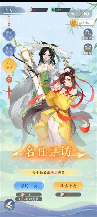 3、当你经营到了一定规模之后,就可以进行店员的招募啦。招募店员需要进行【名士寻访】,每寻访1次,需消耗1遂愿壶,遂愿壶可通过日常任务,厨艺试炼、成就获得哟。不同的店员有不同的属性,厨艺、效率、移速等各有千秋,选择合适的店员上阵,可以自动为客人提供其需求的食品,让你的经营之路更加轻松一些。当然,你也可以在店员自动服务客人的过程中,进行手动服务客人哦。