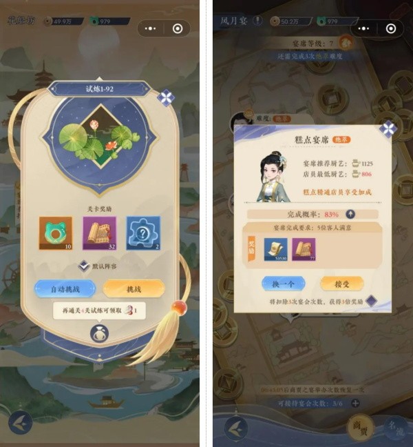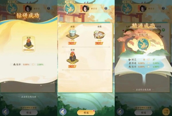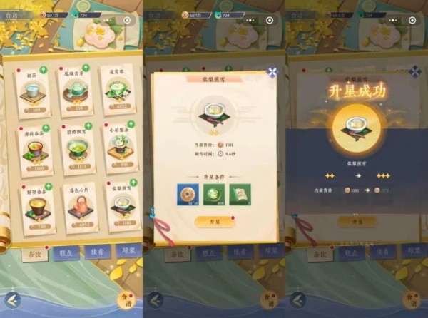 最后,别忘了升级茶馆的【食谱】,有些餐品是有升级潜力的哦!只要使用[铜钱]、[食谱点]和[启蒙书籍],就能让餐品的售价有所提升![食谱点]可以通过【故世游历】获取;[启蒙书籍]可以通过【名流之宴】、【故世游历】获取;[食谱点]也可以通过【杂货商肆】购买哦。