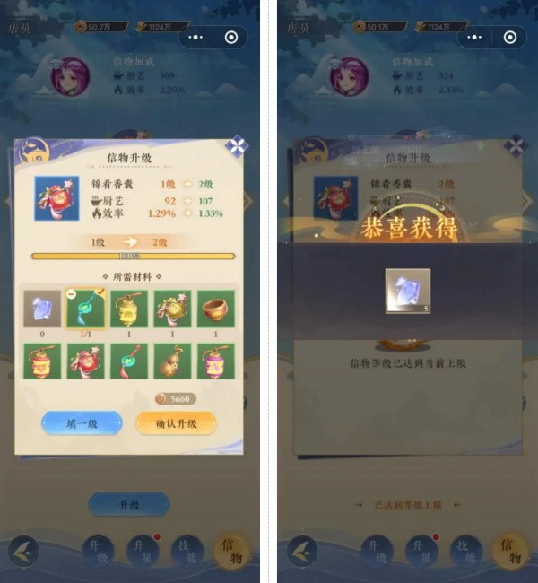 除了以上几点培养店员的方式外,还可以通过佩戴[信物]来提升店员的能力。[信物]可以通过【万铺争鸣】活动获得。[信物]的升级比较简单,可以通过[灵韵]升级,也可以把多余的[信物]分解成升级所需的材料。