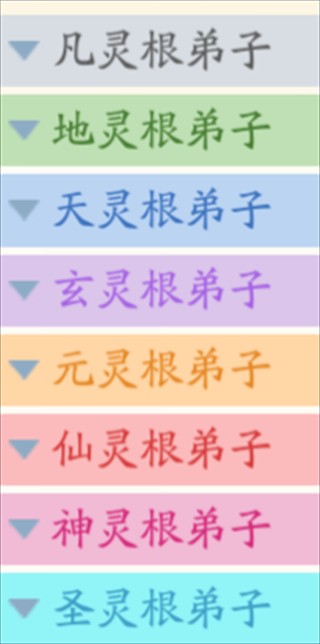 弟子品质上分为凡灵根、地灵根、天灵根、玄灵根、元灵根、仙灵根、神灵根、圣灵根8级。灵根品质越高,基础属性系数起点越高,掌门获得的基础属性增益越强。弟子等级提升可以带来攻击、防御、气血的百分比加成。但弟子增幅等级与弟子等级无关,只和弟子灵根品质相关,比如,凡灵根的体修伤害减免是Ⅰ级,地灵根的体修伤害减免是Ⅱ级。