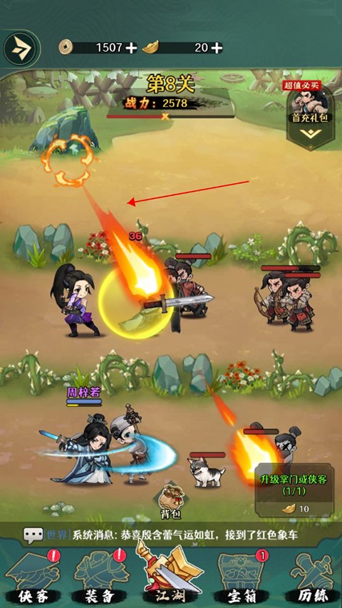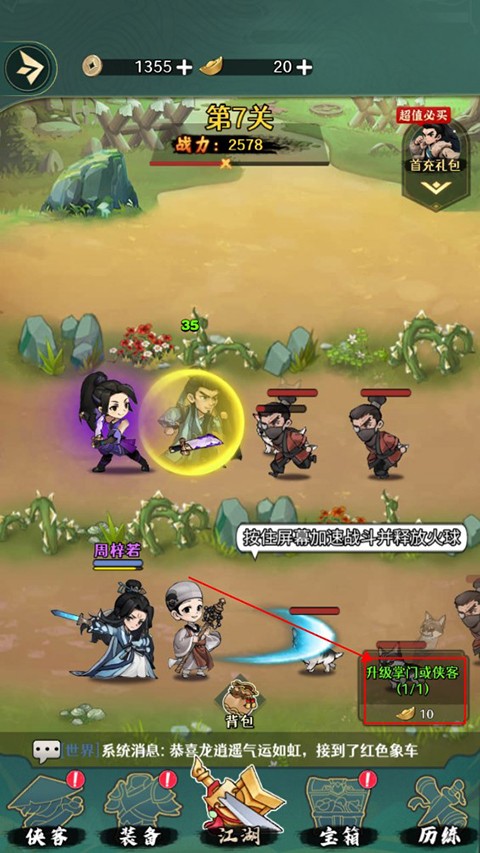 1、游戏围绕主线任务展开,侠客会自动作战,轻松击退敌人,玩家只需点击主线引导即可推进进程。